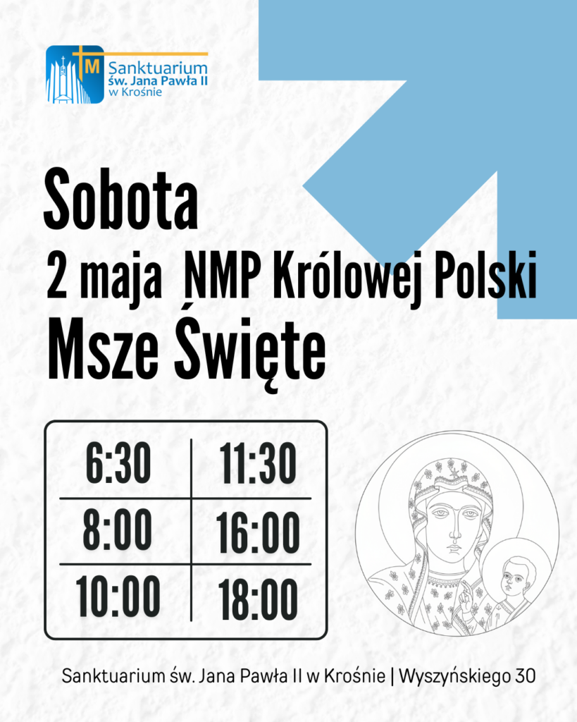📢 W naszym kościele uroczystość Najświętszej Maryi Panny Królowej Polski została przeniesiona na sobotę, 2 maja. 🙏 Msze Święte będą odprawiane jak w niedzielę. Serdecznie zapraszamy!