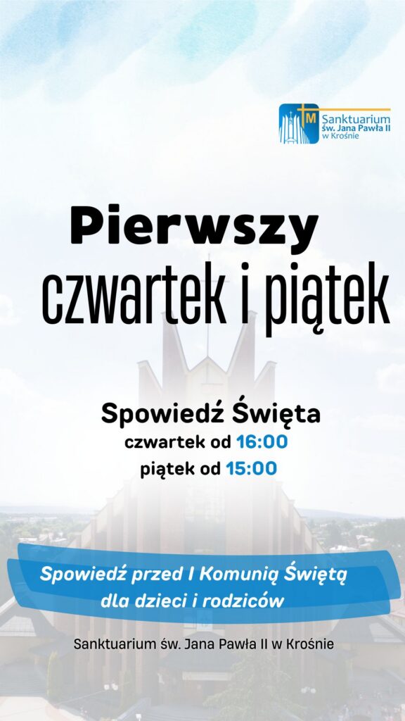 W tym tygodniu przypada pierwszy czwartek i piątek miesiąca. Przypominamy, że spowiedź w tych dniach jest równocześnie spowiedzią dla dzieci i rodziców przed I Komunią Świętą. Czwartek od 16:00 Piątek od 15:00